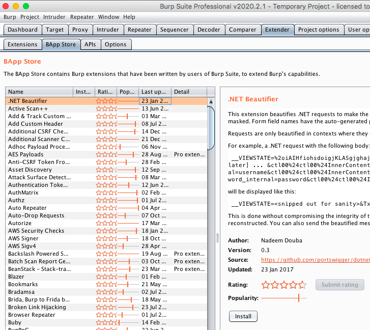 After the environment settings are completed, we can add extensions in two different ways. The easiest way to add an extension is go to BApp Store under the Extender tab & choose a extension from the list that you may want to add & use as per your need. Just click install from the right pane to install the extension. To successfully install a extension, the relevant environment setting is a must. Some extensions are available for community version but some are available for only professional version of the tool.